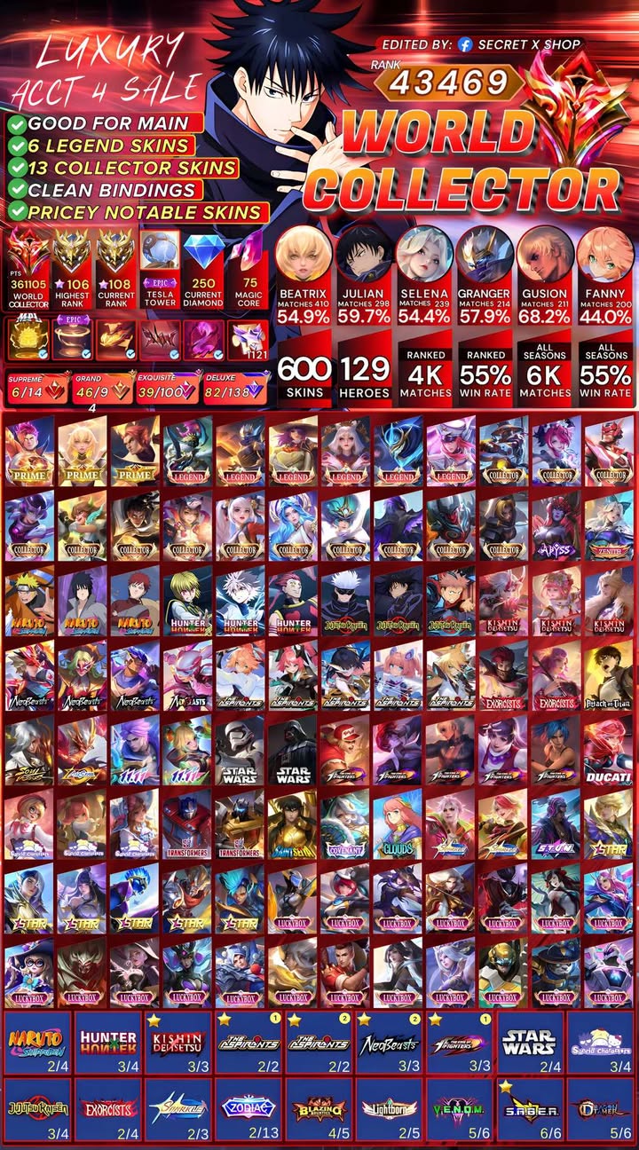 -13% Php150,000 Php130,000 887 Skins World Collector Top GLobal Pharsa (High winrate) >> CLICK HERE << TO VIEW THE CLEAR IMAGE OF THE ACCOUNTMage Main, High Winrates, 500 stars highest rank, Luxury account World Collector Accounts