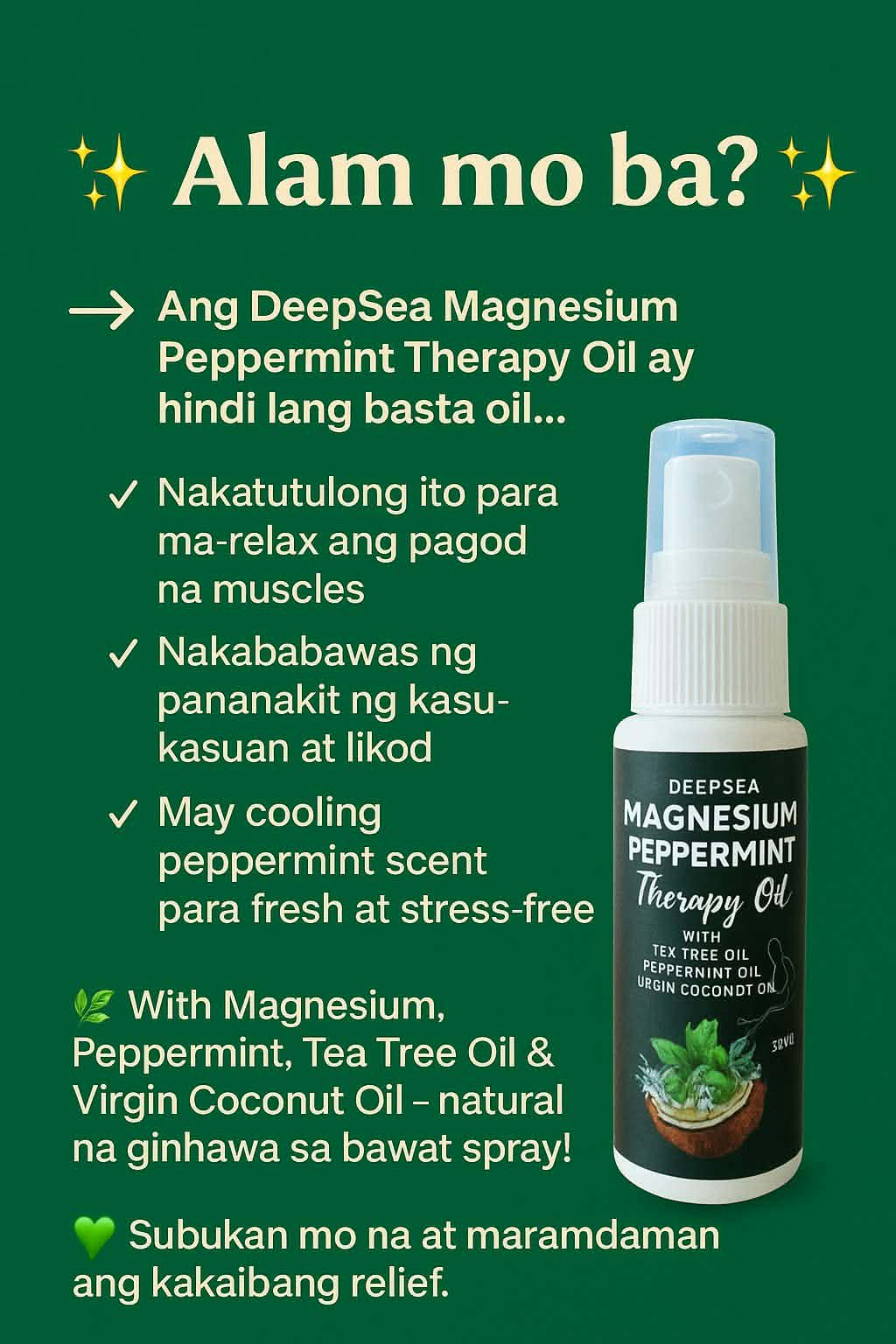 DEEP SEA MAGNESIUM PEPPERMINT THERAPY OIL SPRAY - All Mineral, All Natural, Transdermal Therapy- minerals from the Dead Sea, Israel- 30ml per bottle, FDA NN-1000007509084- Manufacturing Date: 10/20/25 Exp. Date: 10/20/27- Ingredients: Coconut Oil, Virgin Coconut Oil, Tea Tree Oil, Nitric Oxide, Peppermint Oil, Magnesium Chloride, Crystal Menthol & Virgin Olive Oil.FREE - 1 Scalar Energy Anti-Radiation Sticker worth SRP 350 Pesos. 650 Pesos total product value + 1 FREE SLOT from 1-20 numbers to the SPIN THE WHEEL RAFFLE 500. Choose your number slot/s. 1 Purchase = 1 Number Slot. Maximum of 10 number slots only!1.2.3.4.5.6.7.8.9.10.11.12.13.14.15.16.17.18.19.20.